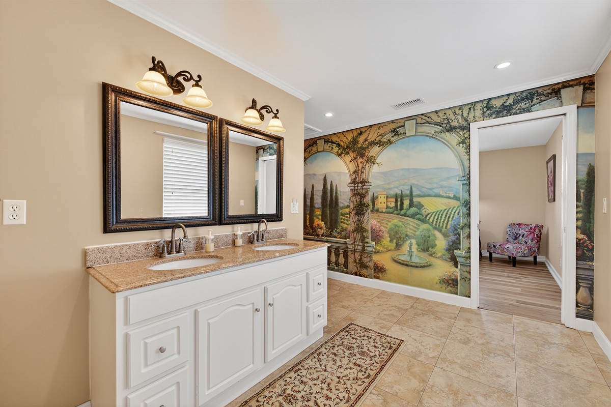 Need to catch up with the office? Downstairs bedroom has a desk with monitor. The west wing has all the charm of the original 2 bedroom home with a wet bar, living room, and gorgeous beamed ceilings. Each bedroom has a queen bed, and one has an en-suite private bathroom.