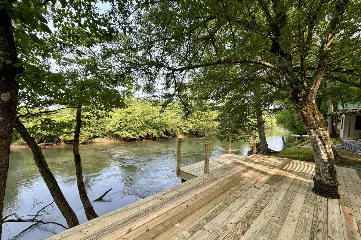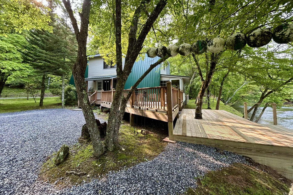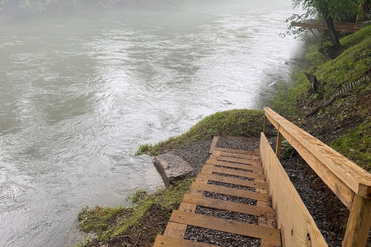 Private riverfront with steps down for fishing, swimming, or wading